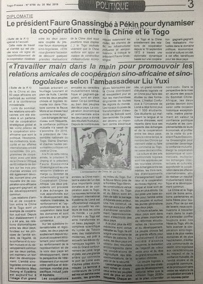 2016年5月30日,驻多哥大使刘豫锡在《多哥新闻报》等当地主流媒体上发表题为“携手共进,推动中非、中多友好合作关系迈上新台阶”的署名文章。文章全文如下: